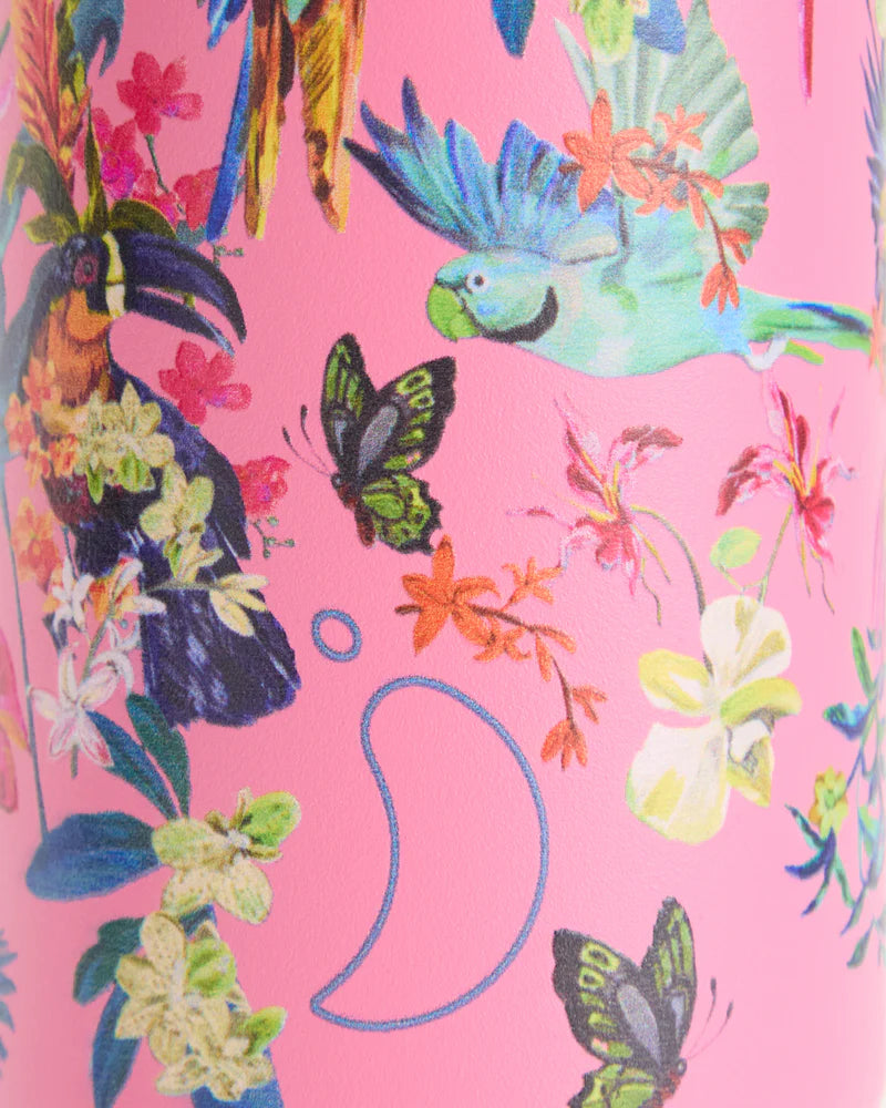 Macaw Madness unleashes a ditsy tropical scene where tiny parrots, palms, butterflies and vibrant plantlife create high-intensity colour overload.