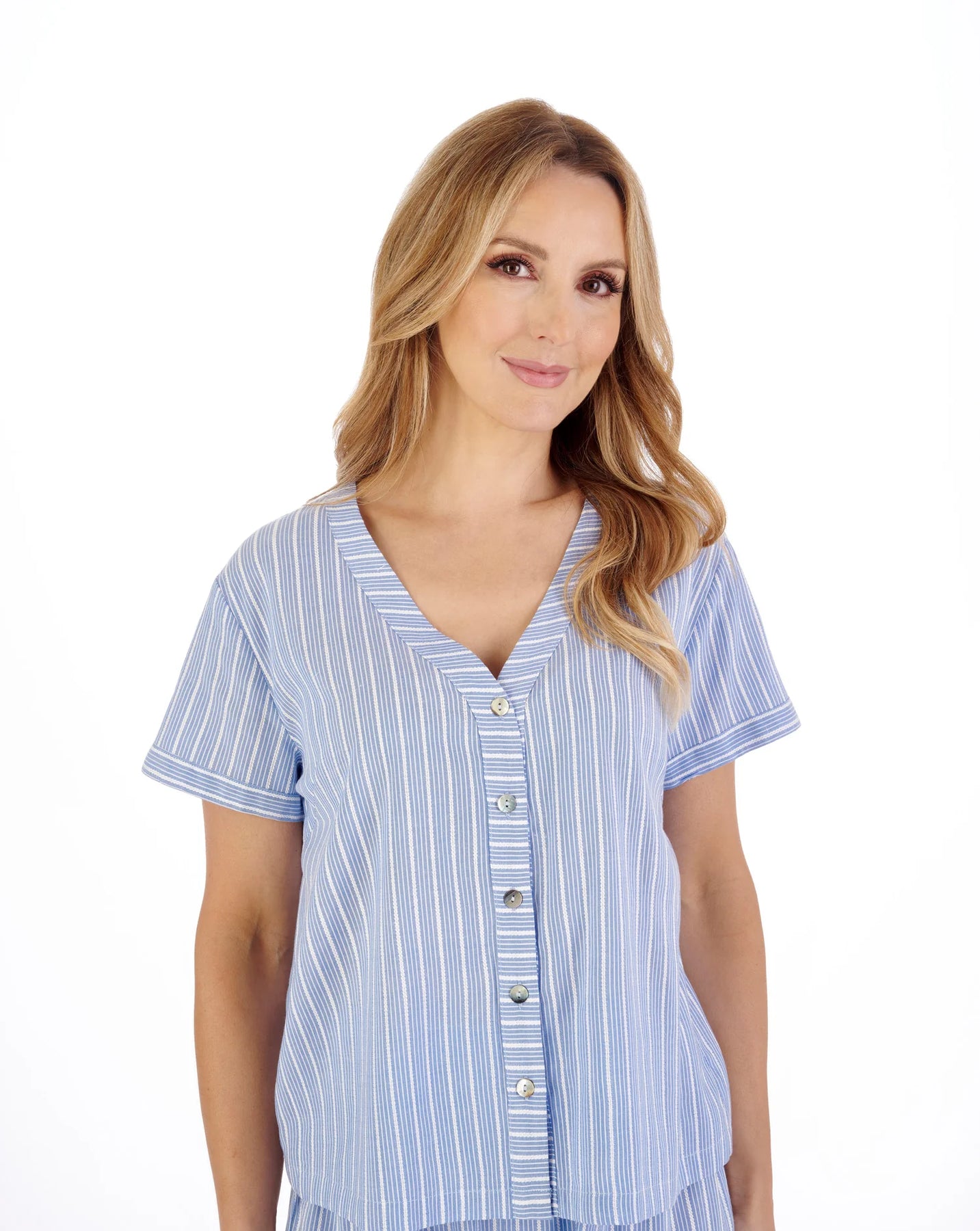 Made from a blend of 70% cotton and 30% rayon, this woven pyjama set is designed in a modern textured stripe design adding a touch of sophistication to a comfortable set. The short sleeve style top features a 5 button front opening for convenience and elasticated waist to the trouser provides ease of movement.