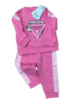 Pink jersey shortie for baby girls by Guess, patterned with little red cherries and 4g logos. Made with organic cotton, the short sleeves and popper fastenings provide ease of wear. A glittery pink Triangle logo is printed on the front for a branded look.
