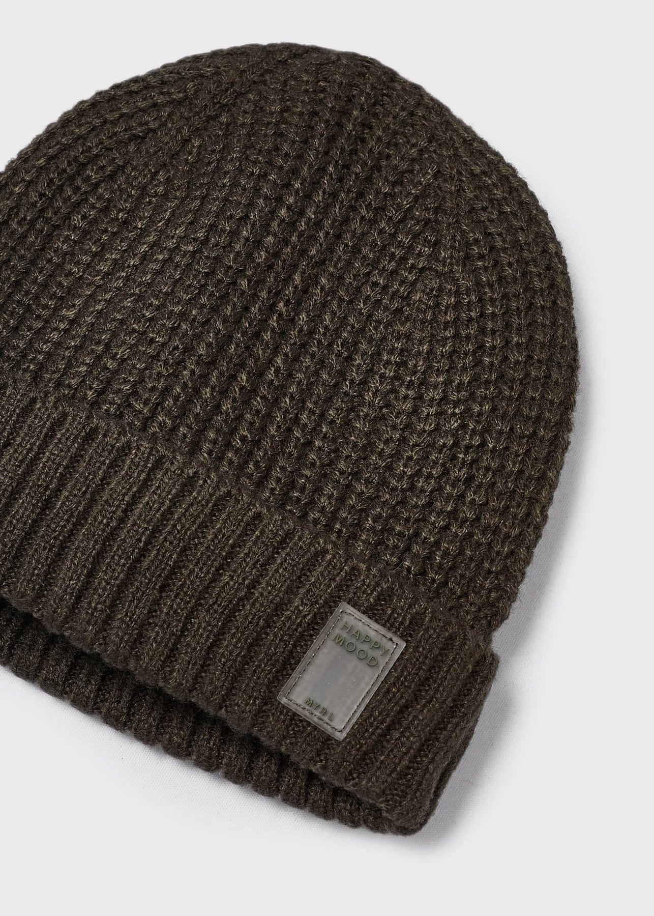 Cosy beanie hat for boys by Mayoral, in a soft, chunky knit. It has a clear rubber logo patch on the turned up brim, with the words 'Happy Mood' for a positive vibe.