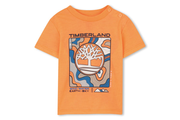 Timberland 100% cotton from organic farming jersey short sleeves T-shirt, snap fastener at shoulder, printed illustration on front.