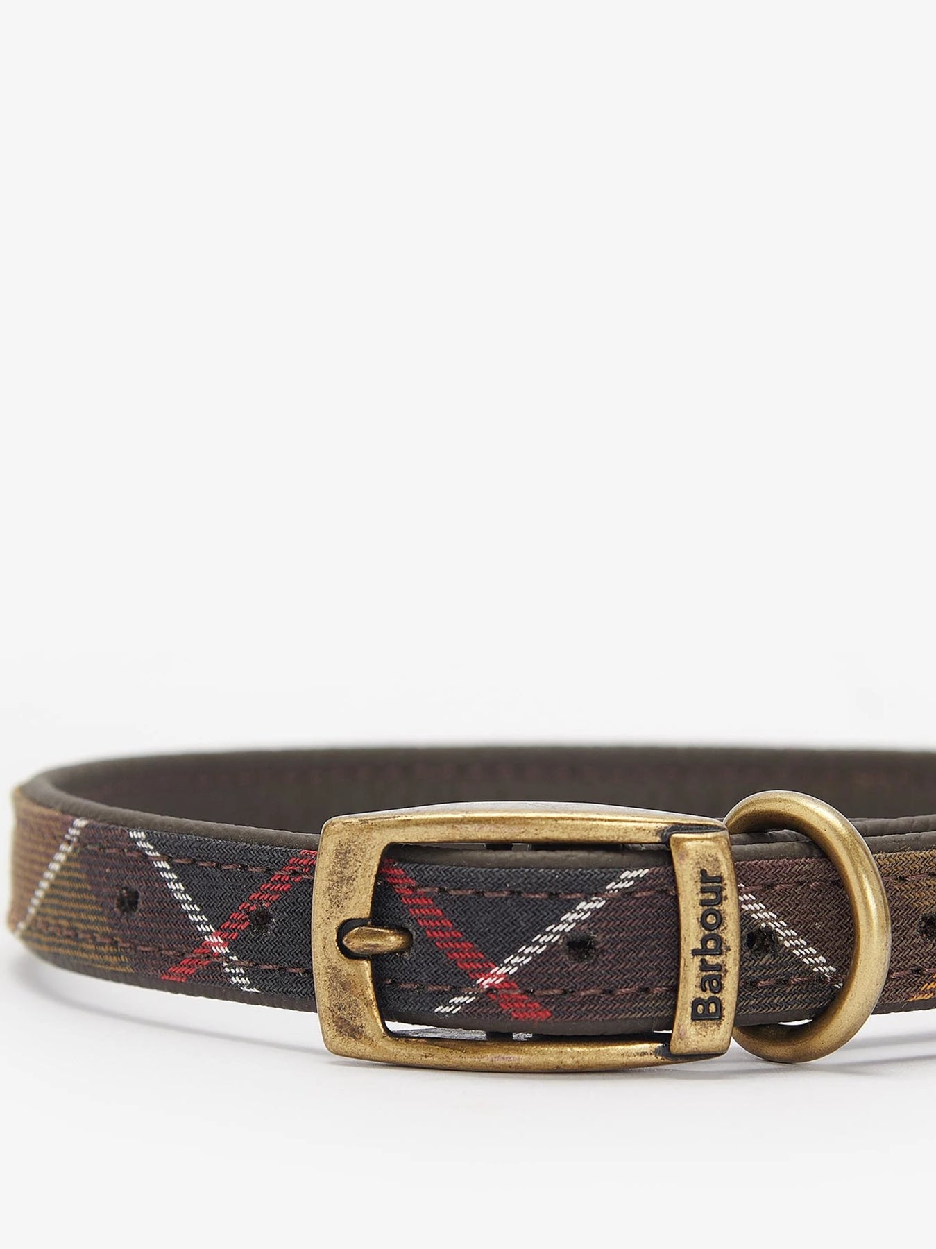 This adjustable dog collar features a cotton Barbour Tartan outer and a real leather lining. It's fitted with an aged-effect brass buckle and keeper loop, and finished with an embossed badge. A matching lead is available.