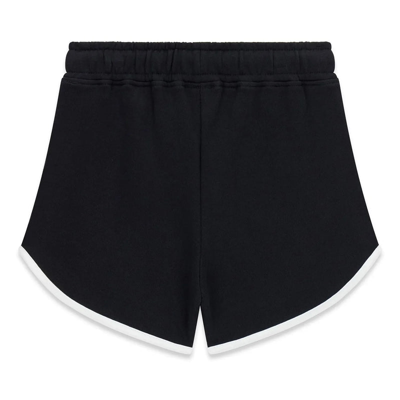 These jet black girl's track shorts from Guess feature an elasticated drawstring waist, contrasting white trim, and a pink embroidered logo above the hem.