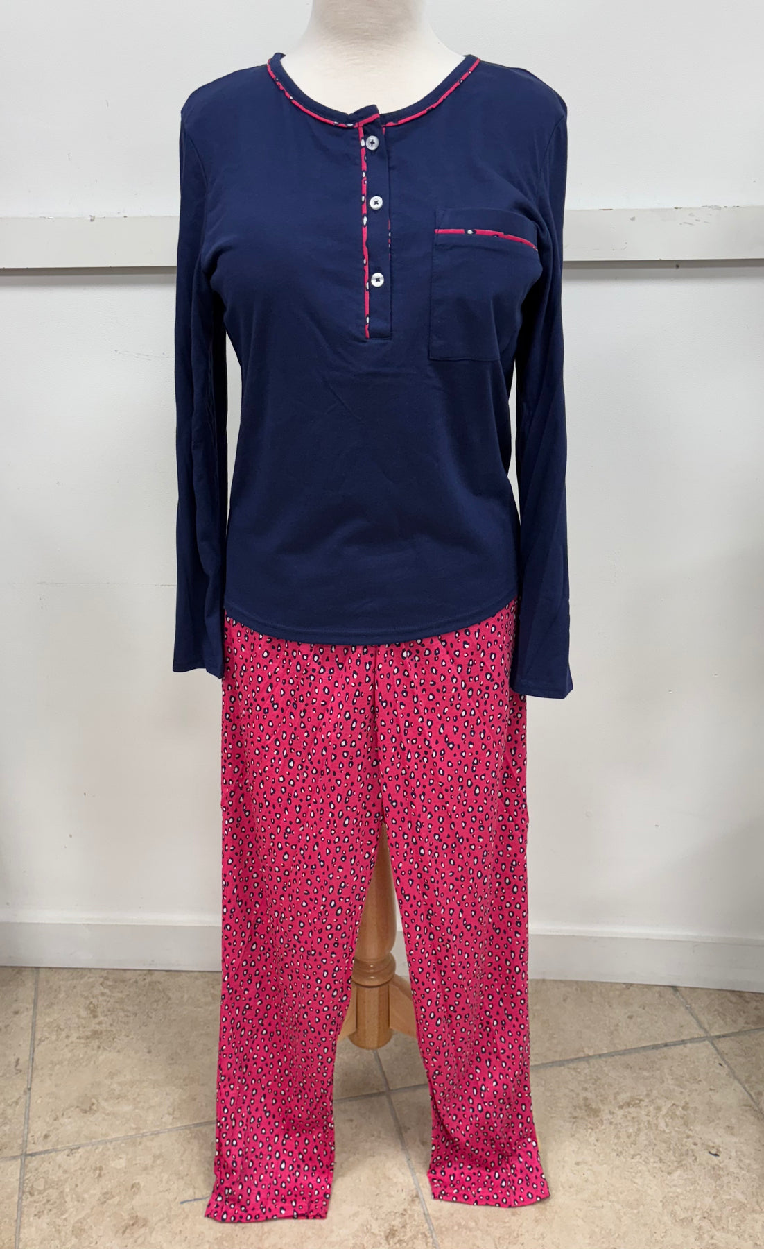 This sleepwear set features a soft pink or navy long-sleeve top with a neat chest pocket and contrasting dark trim details, paired with dark blue or pink bottoms decorated with animal print. Making the outfit both comfortable and stylish for lounging or bedtime.