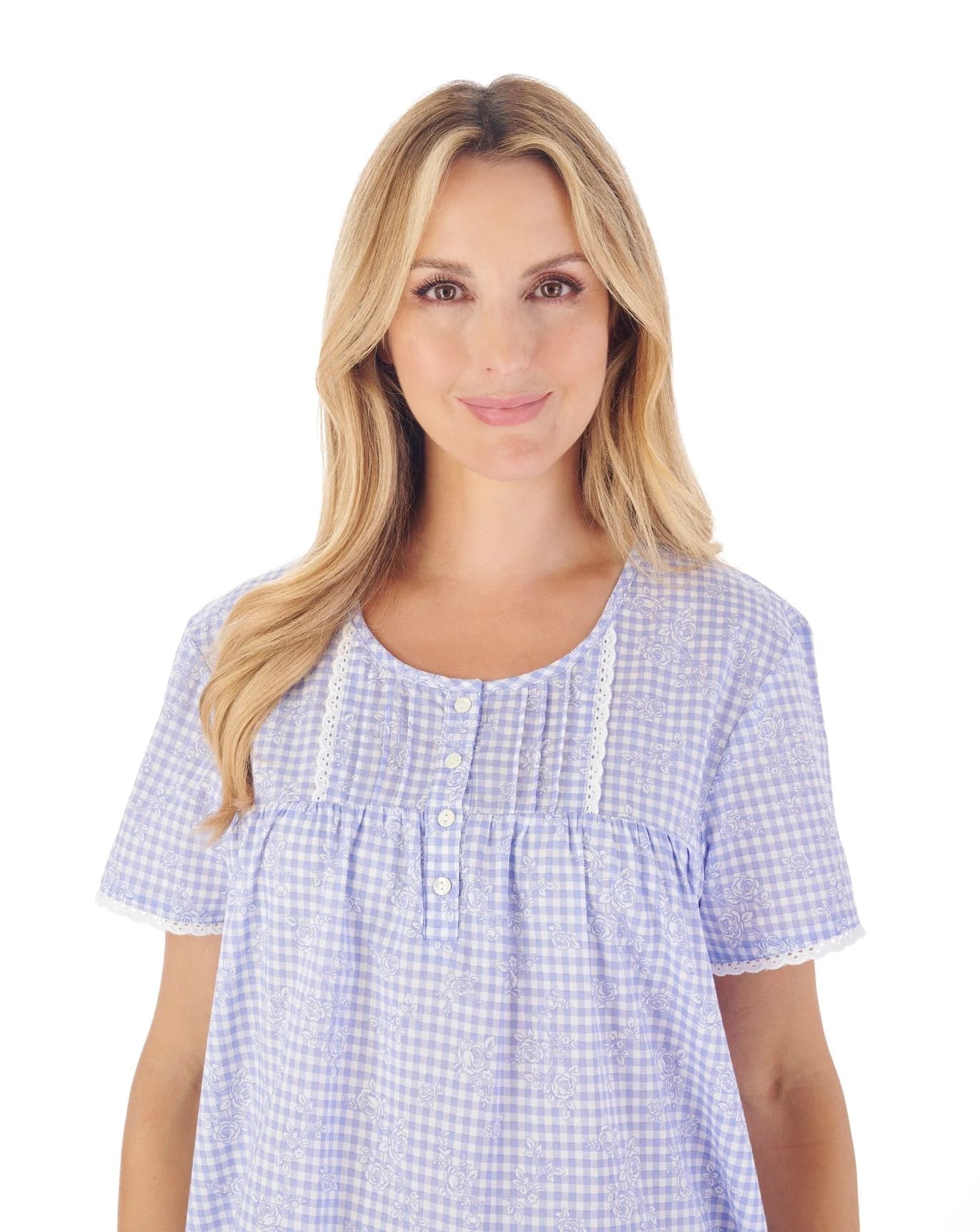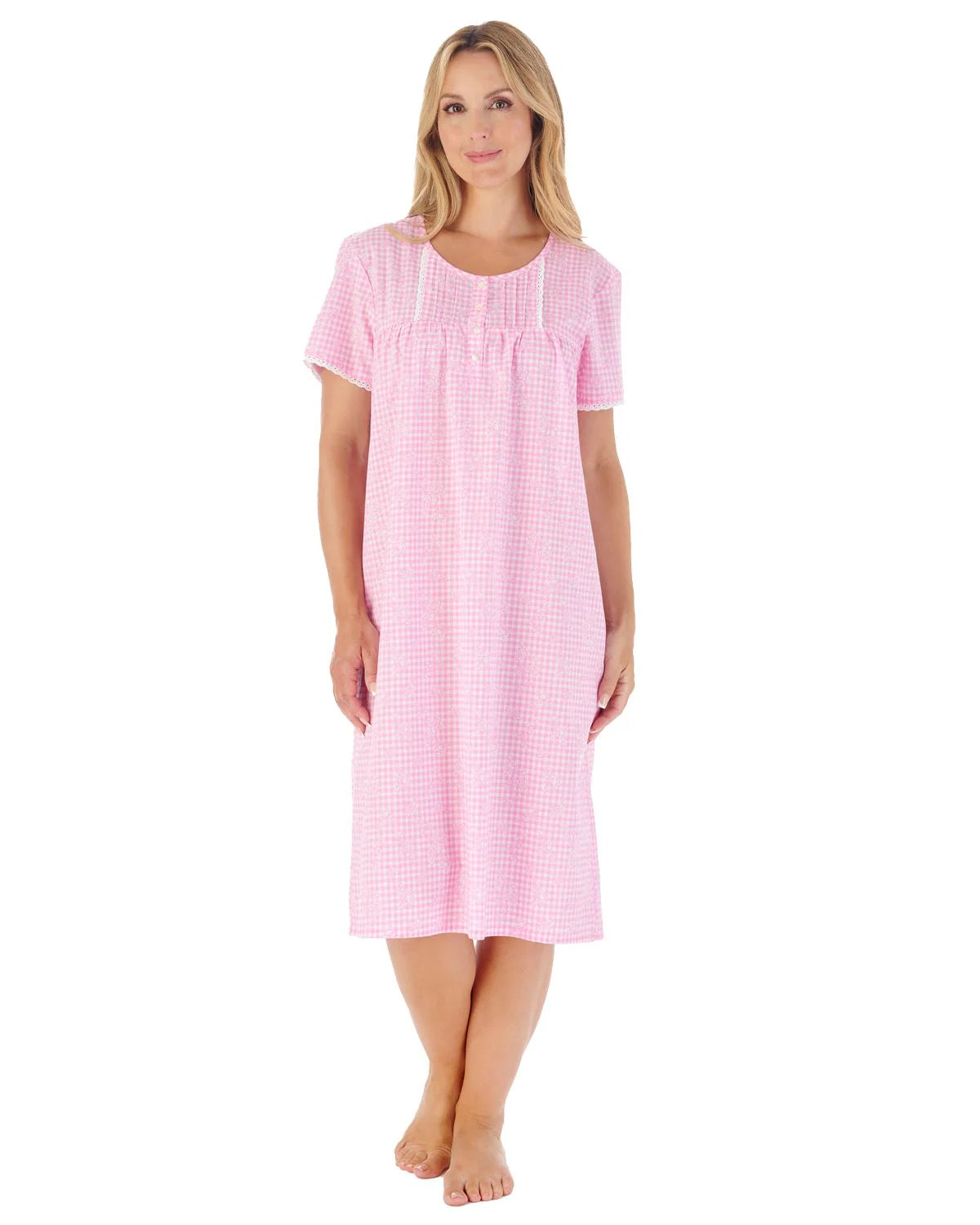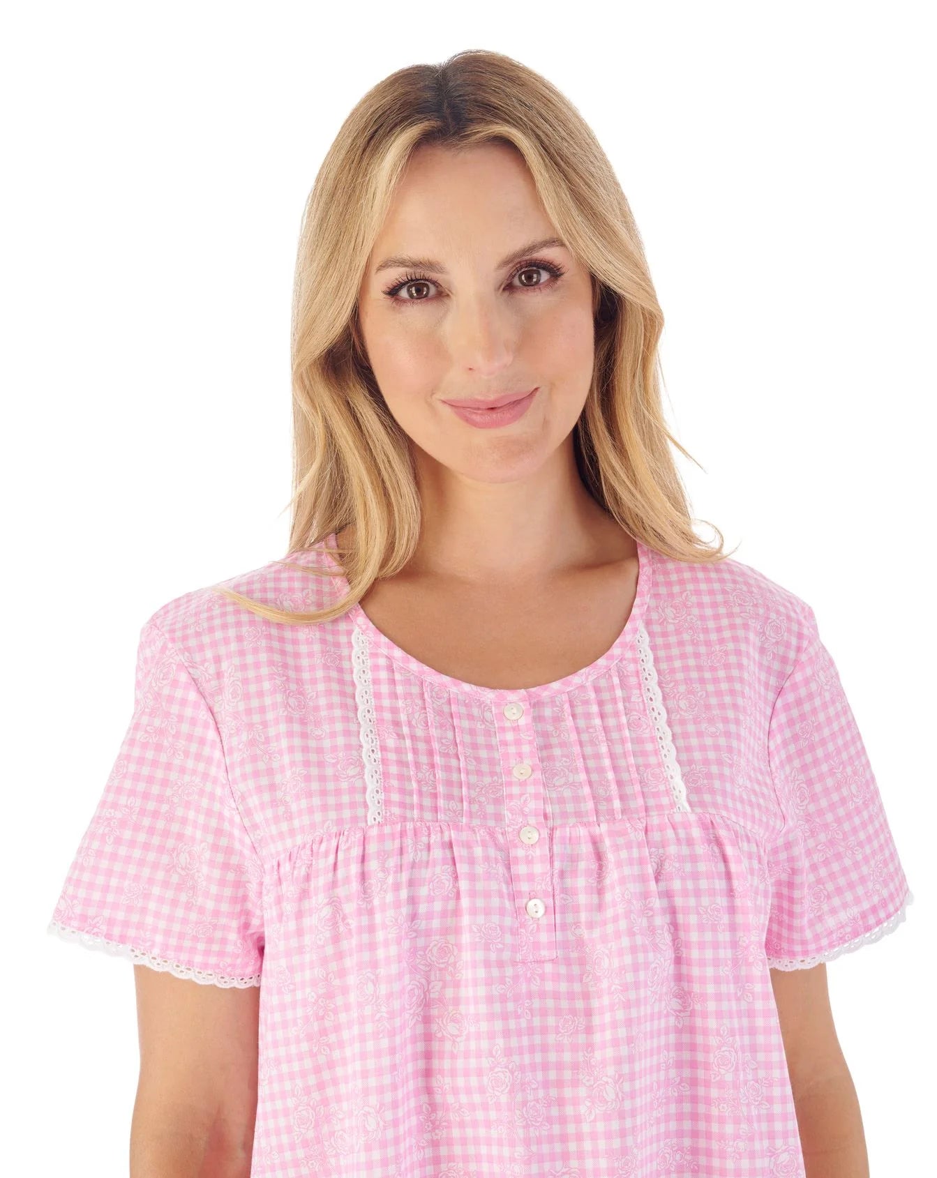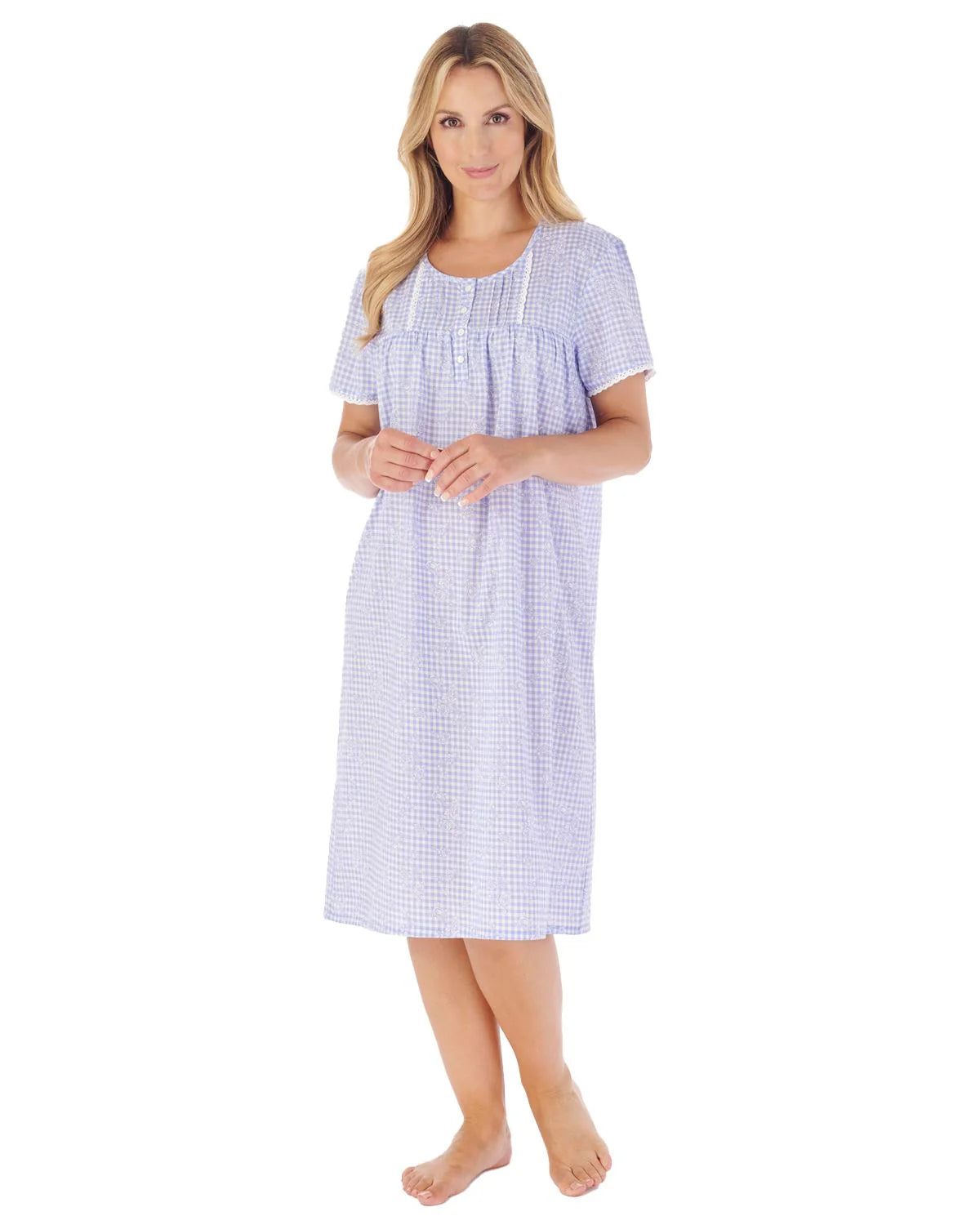 A modern style nightie designed with short sleeves for added comfort and fit. With a delicate lace detail and vertical pintucks to the yoke, the nightdress is finished with 4 button placket to the centre front for that added modern but classic look. Made from 100% Woven cotton fabric for comfort during the warmer months.