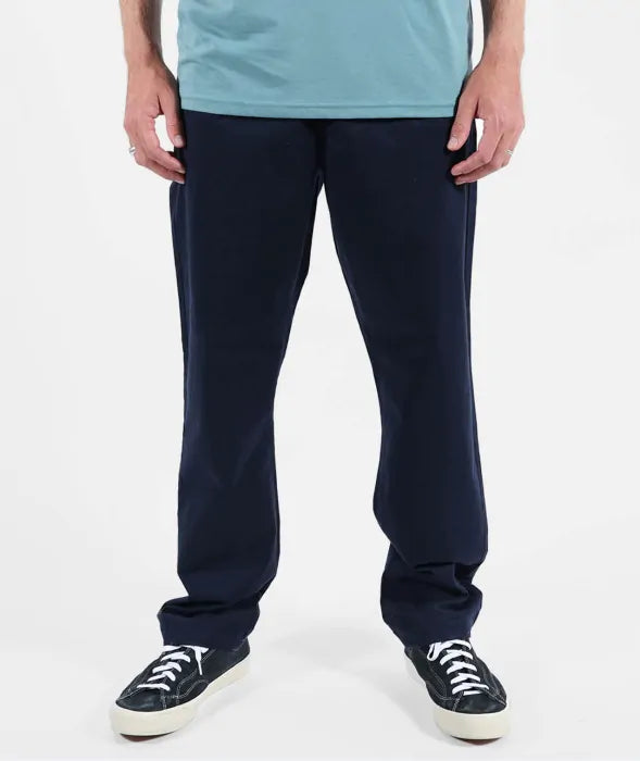 Comfortable stretch pants in peach-touch twill, elasticated waistband with drawstring, welt side and back pockets, mock fly, length 76–79.5 cm depending on size.