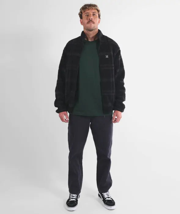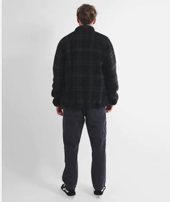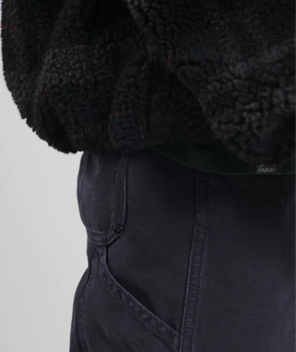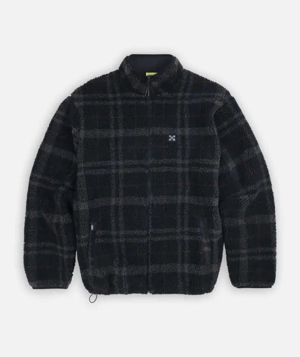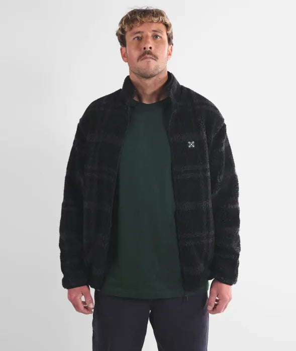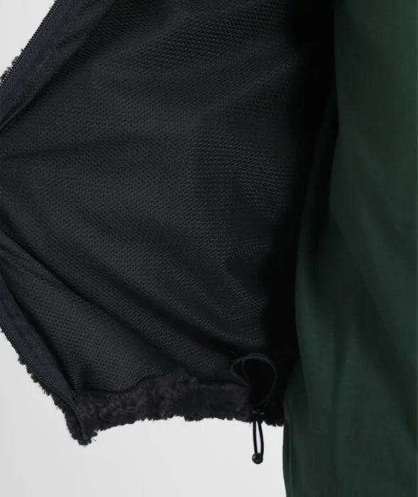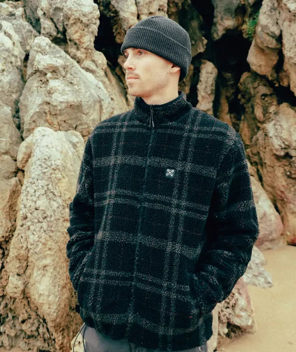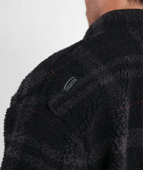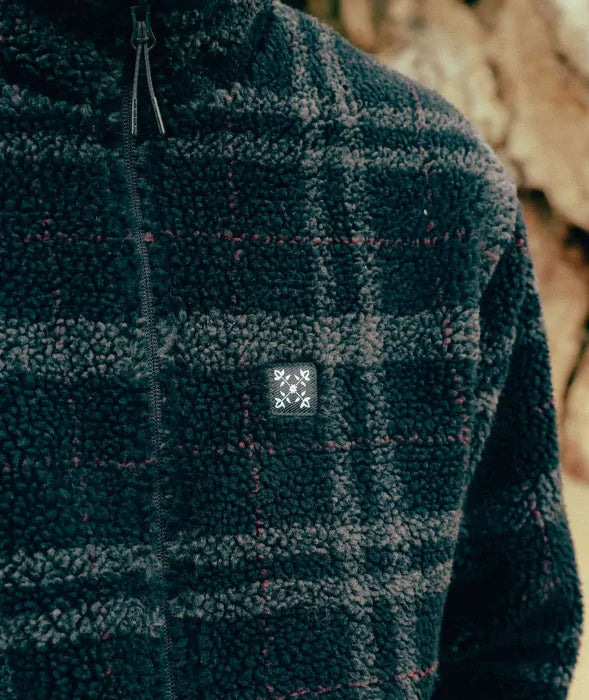Printed recycled sherpa zip-up fleece 380g, high collar, practical pockets, and adjustable hem.