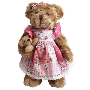 Slightly shaggy and delightful to cuddle, this super soft bear has velvety paws, fixed eyes, jointed limbs, and an embroidered mouth and nose. She wears a frilled dress in our exclusive unicorn print which is trimmed with lace around the hem, has a matching bow on her head, and sweetly holds her own little teddy bear.