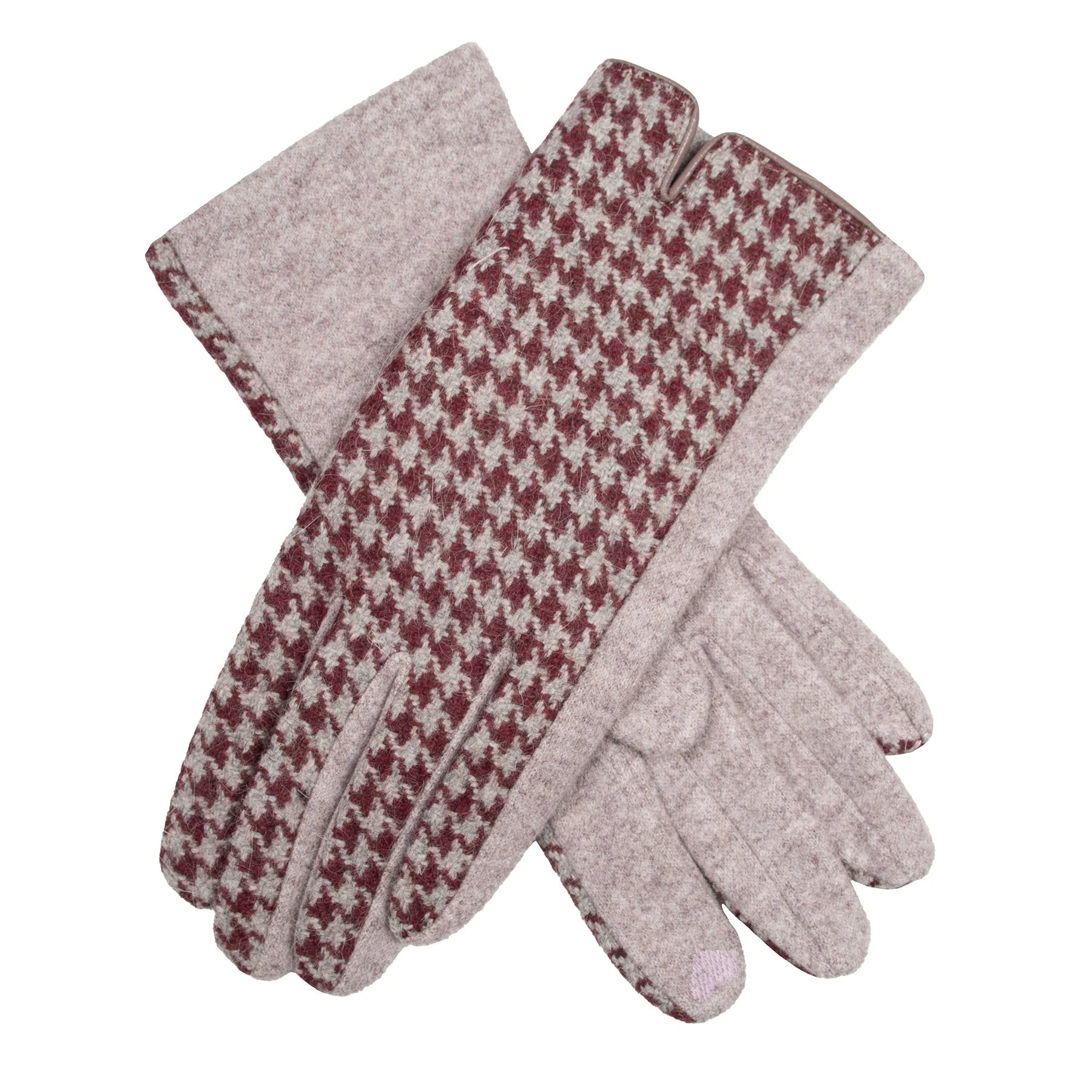 Up the elegance this season with our classic dogtooth print gloves - where heritage design meets contemporary convenience. The iconic dogtooth (or houndstooth) pattern brings a touch of vintage sophistication that never goes out of style. Crafted with a hint of spandex for a snug, comfortable fit, these fabric gloves offer back vents for added ease around the wrist and a welted leather cuff for durability and refinement. But it’s not just about looks - they also boast touchscreen technology in the index fingertip and thumb so you can stay connected without sacrificing warmth or elegance. Available in four stunning shades - damson, forest, natural, and black - there’s a dogtooth design for every wardrobe this winter.