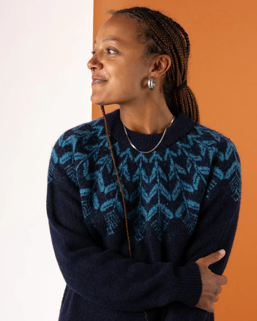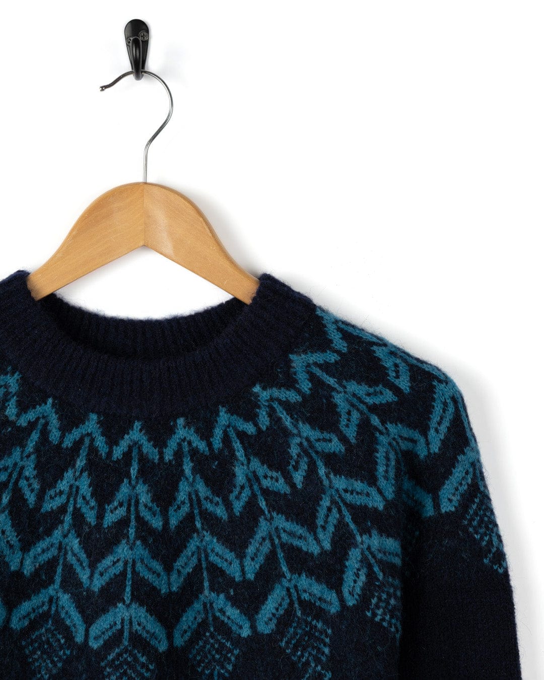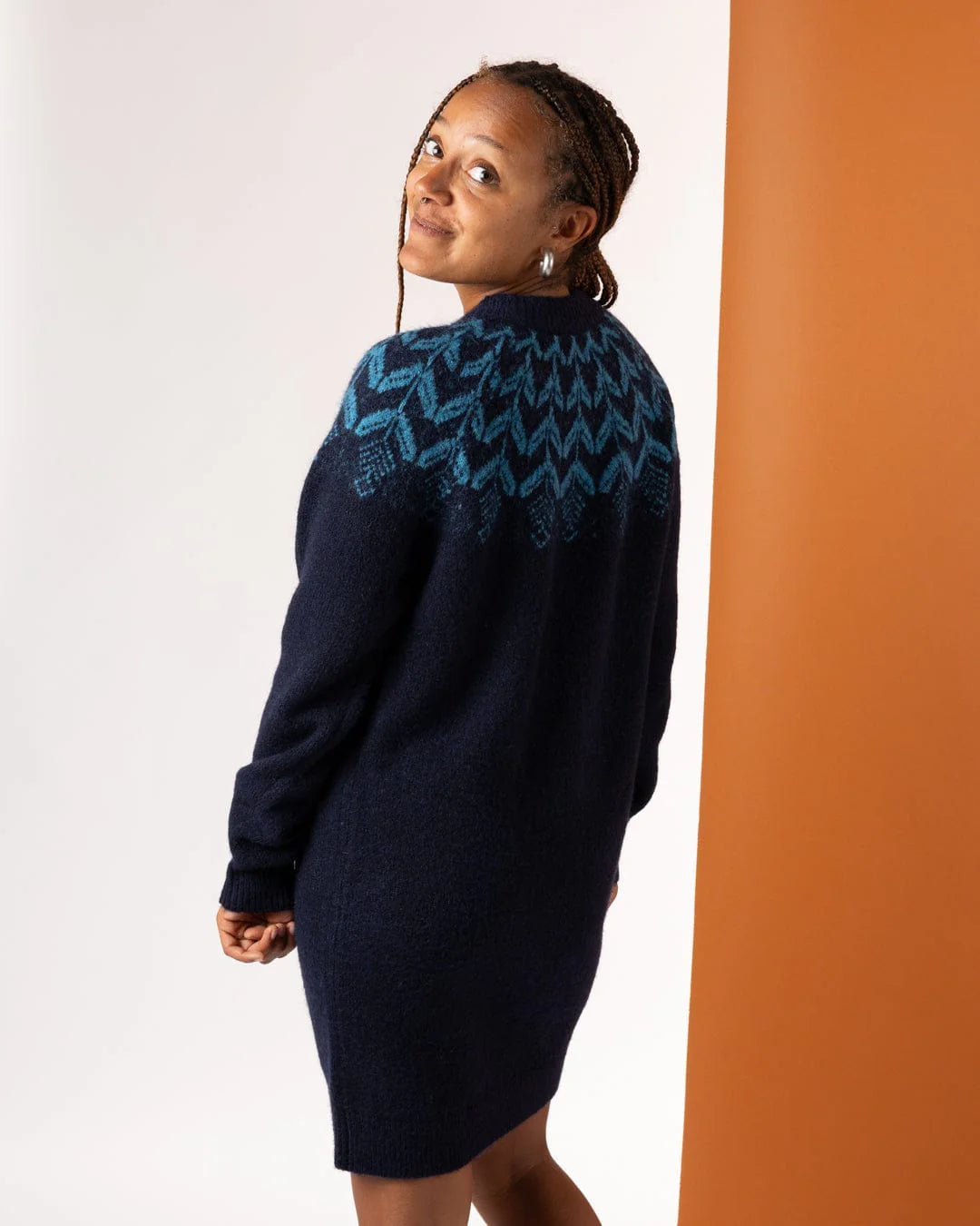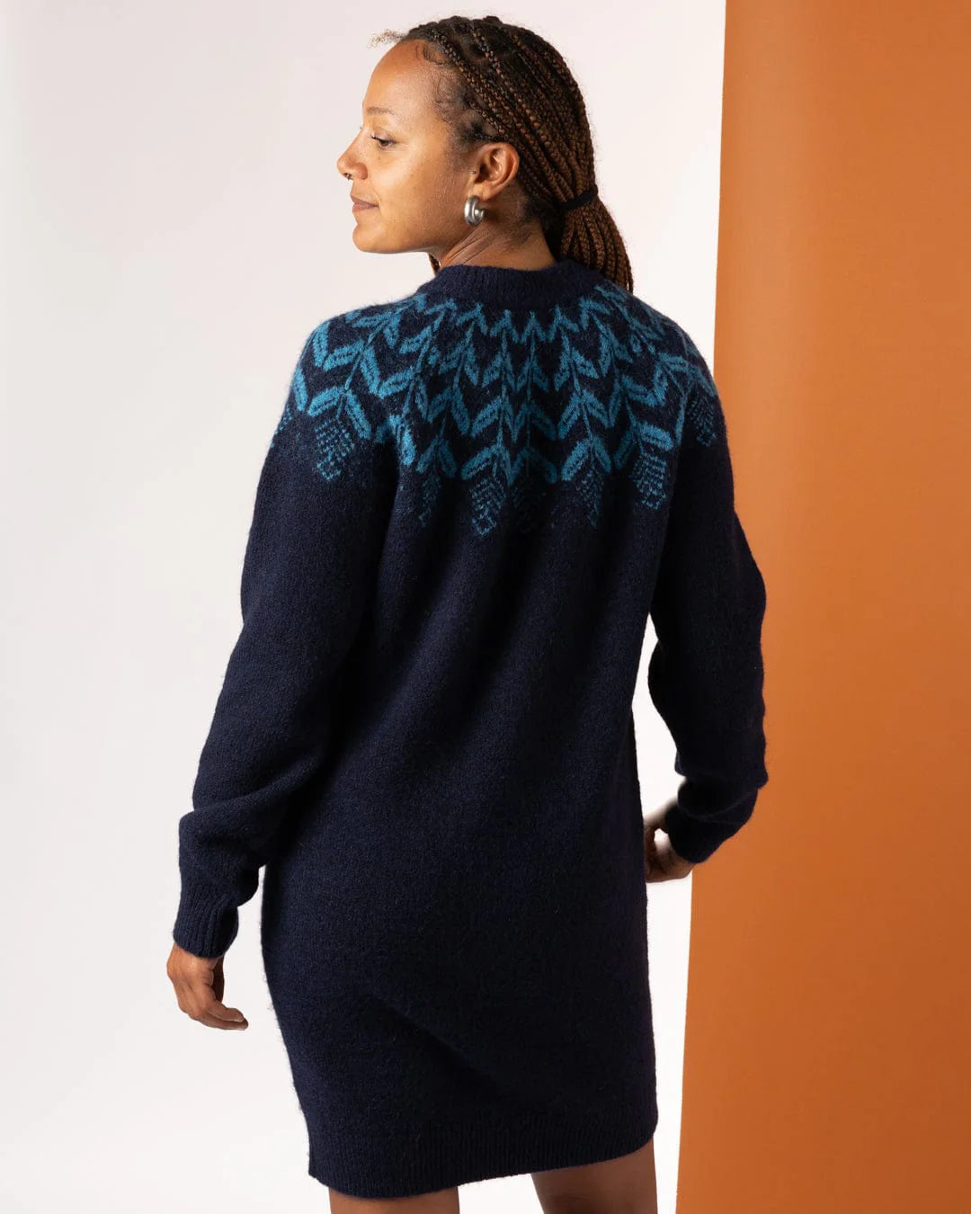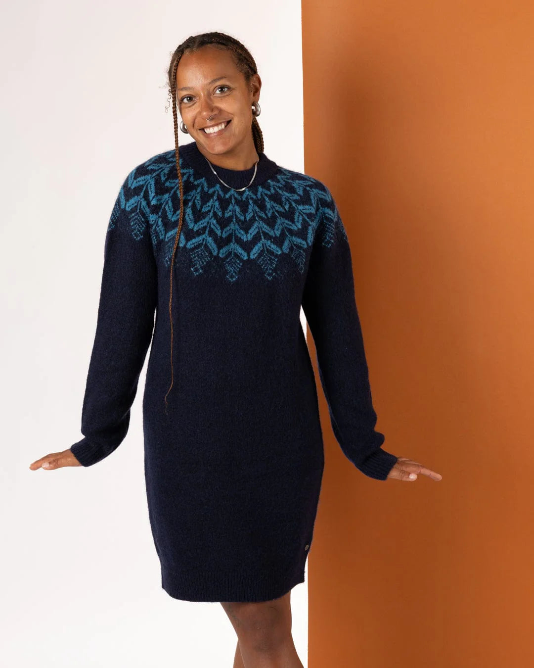 • Blue knitted dress with fairisle design across front, sleeves & back