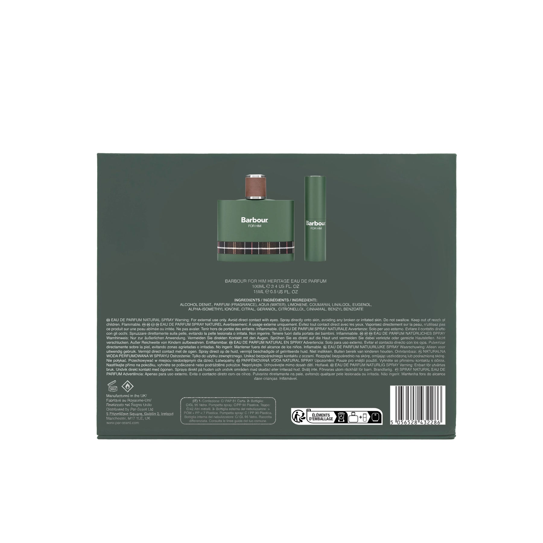 Celebrate the spirit of adventure with the Barbour Heritage for Him Hero Fragrance Gift Set. Including a 100ml fragrance and 15ml atomiser, the Heritage for Him scent allows you to step into the Scottish woodlands with its masculine, woody fragrance. With fresh citrus notes mixed with black pepper and cardamom, and a base of cedar, guaicwood and vetiver - Heritage for Him is a timeless, everyday essential.