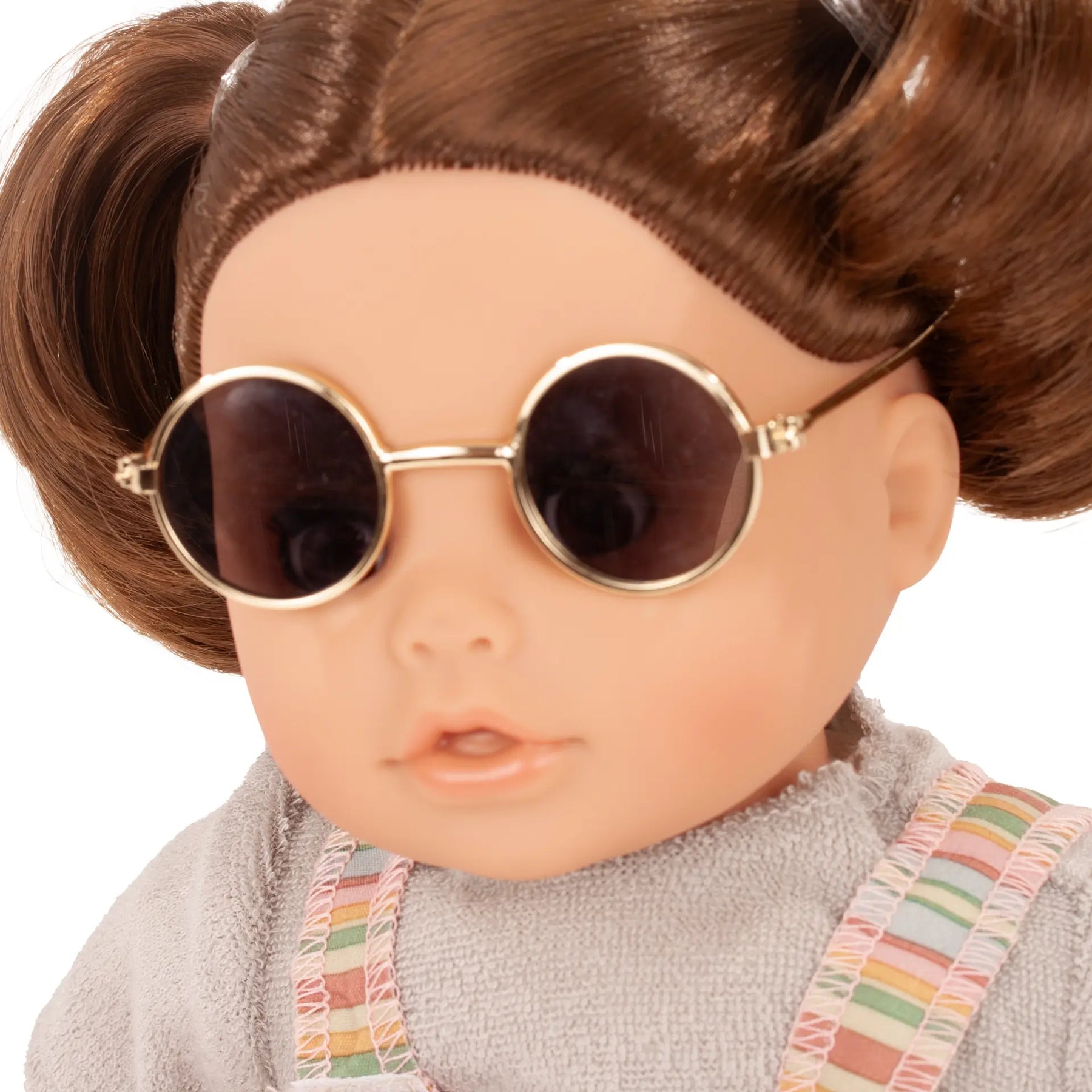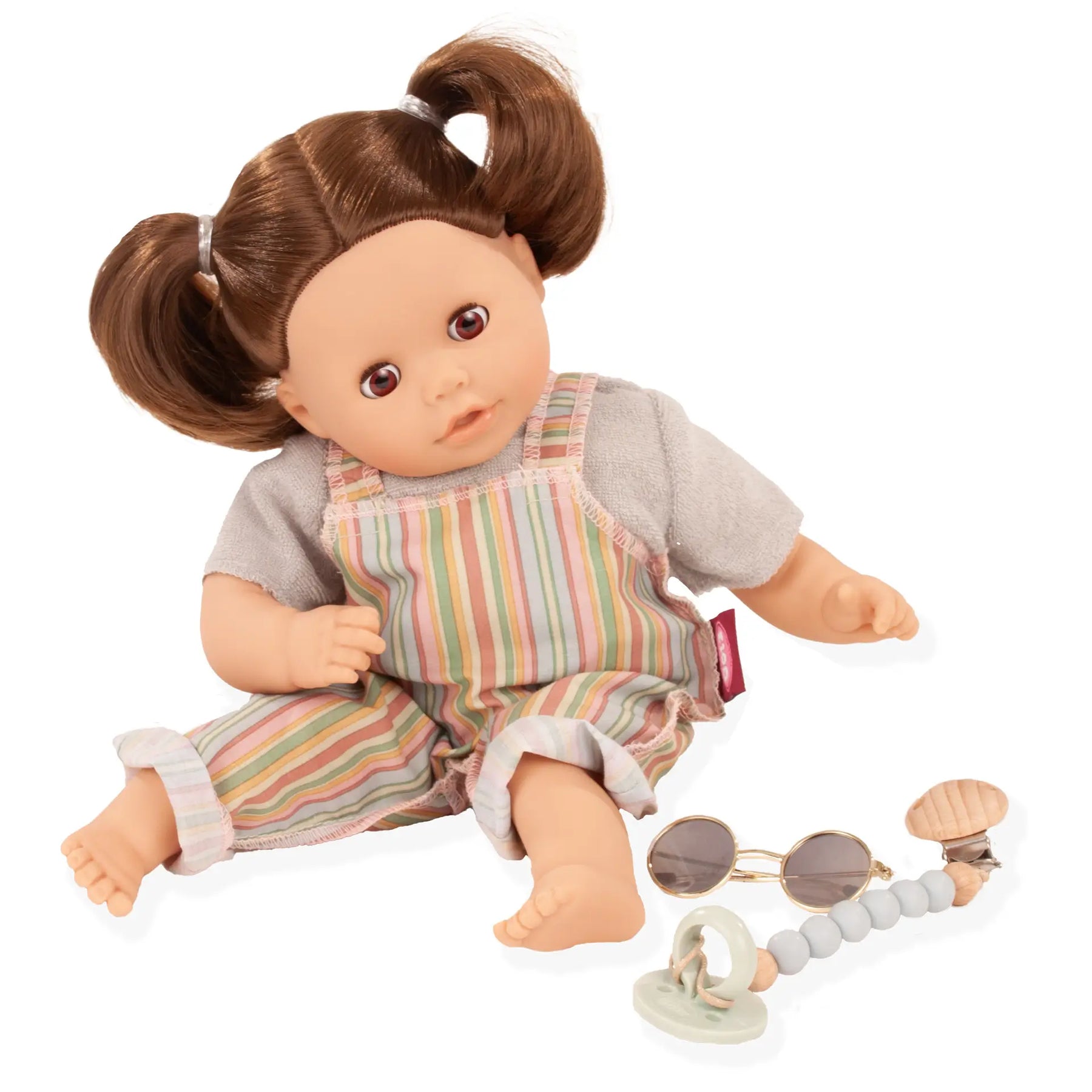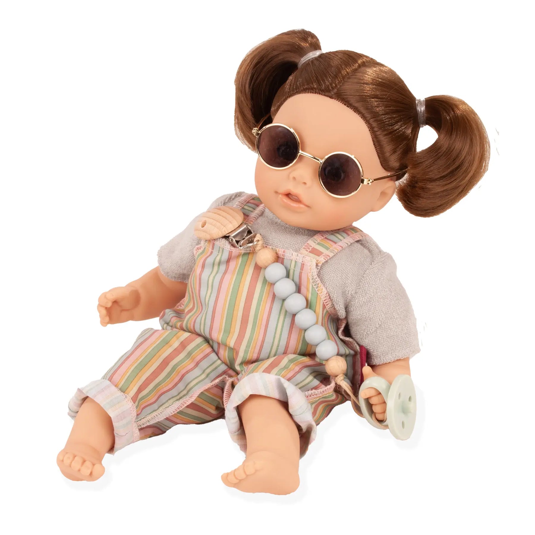 The charming Cosy Aquini Beach Vibes bath doll with sleepy eyes is the perfect companion for little doll parents and water lovers. Whether for cuddling or splashing around – she is the ideal playmate for children. This bath doll wears a stylish striped dungaree, paired with a soft terry shirt and round sunglasses that give her a cool look.