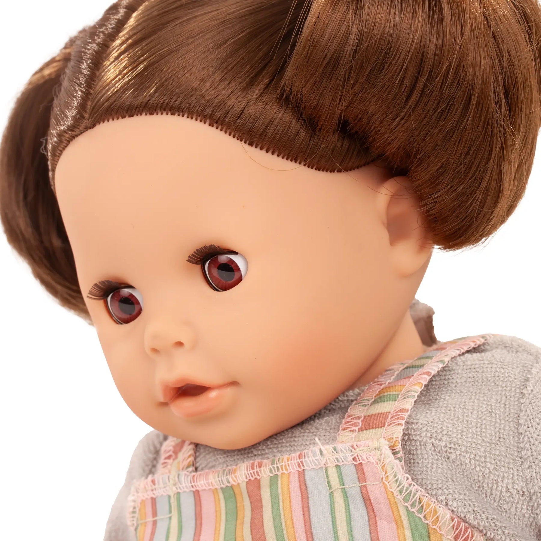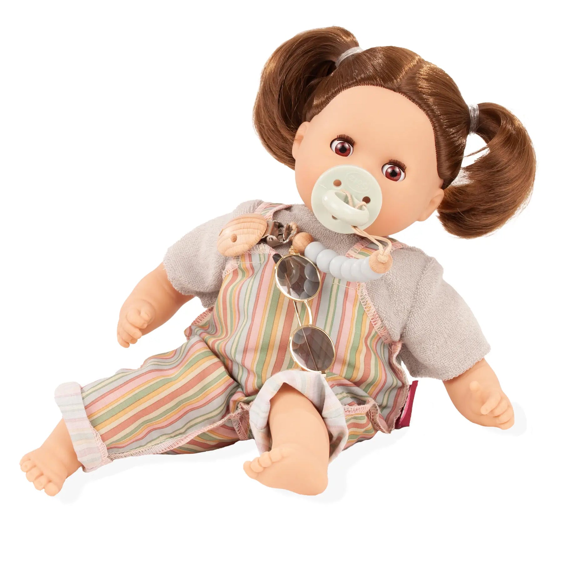 Whether in the bathtub or during imaginative role play, this doll encourages emotional development, sparks creativity, and, thanks to its soft body, is the perfect combination of a cuddle and bath doll. The set includes a pacifier with a practical pacifier chain, ensuring it is always within reach – ideal for realistic playtime. Her brown sleep eyes gently close when she is laid down, allowing for even more creative storytelling.
