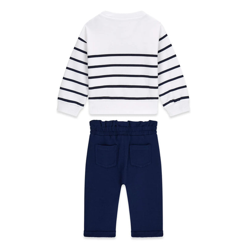 Baby girl's two piece tracksuit from Guess, includes a pair of navy blue bottoms, and a white top with a navy striped design. The top features a red glitter heart logo on the chest, and the bottoms have matching glitter hearts on both knees.
