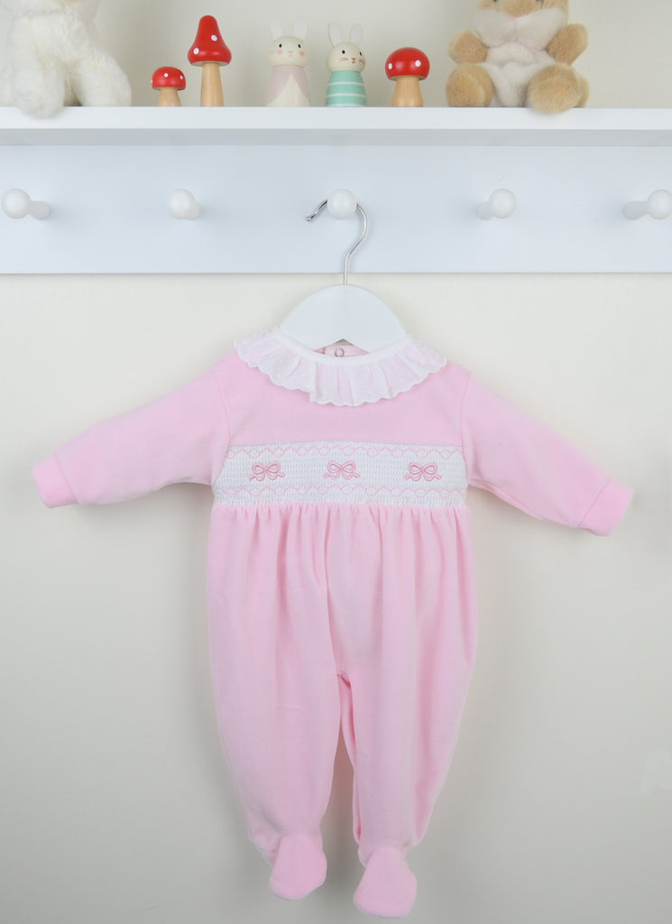 Our beautifully soft pastel pink velour with a pretty smocked panel featuring the cutest little bow embroideries along with a chic white lace collar. Handy press studs down the back and around the legs.